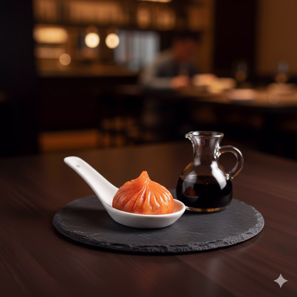 A legendary soup dumpling on the benu filled with a concentrated broth of lobster coral and served with aged soy sauce.
