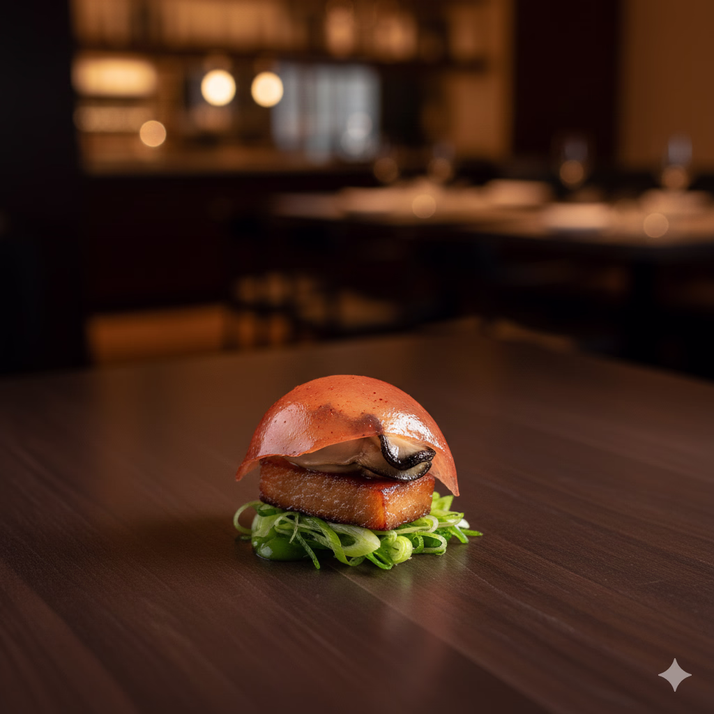 A complex single bite on the benu featuring braised pork belly and oyster encased in a dehydrated kimchi broth "glass."