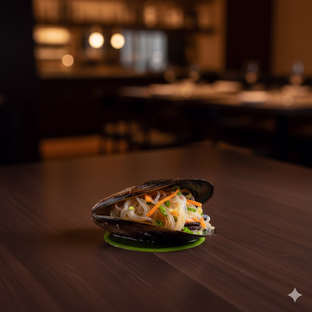 A poached mussel stuffed with glass noodles and fine vegetables, showcasing the delicate presentation of the benu.