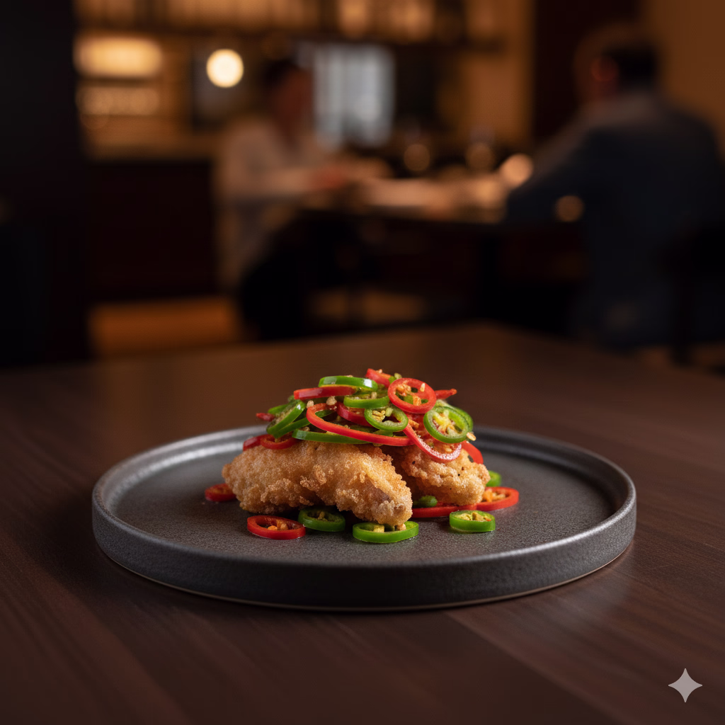 A punchy dish on the benu where a crispy frog leg is sautéed with chili and hidden beneath a bed of peppers.