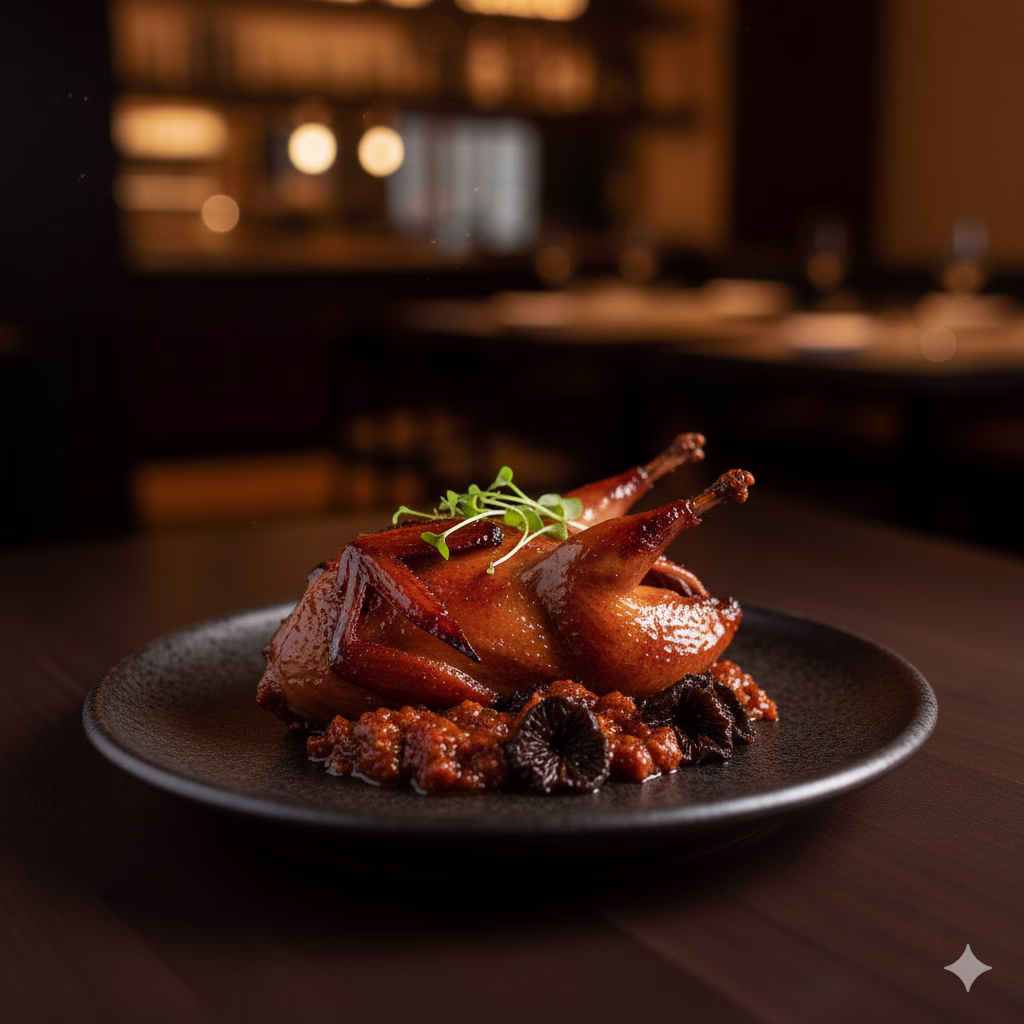 A whole Wolfe Ranch quail, honey and soy-marinated, served with house-made XO sauce and black trumpet mushrooms on the benu.