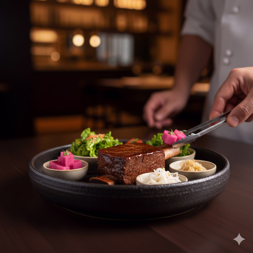 Tender beef rib served tableside with traditional Korean sides like kohlrabi kkakdugi and lettuce namul from the benu.