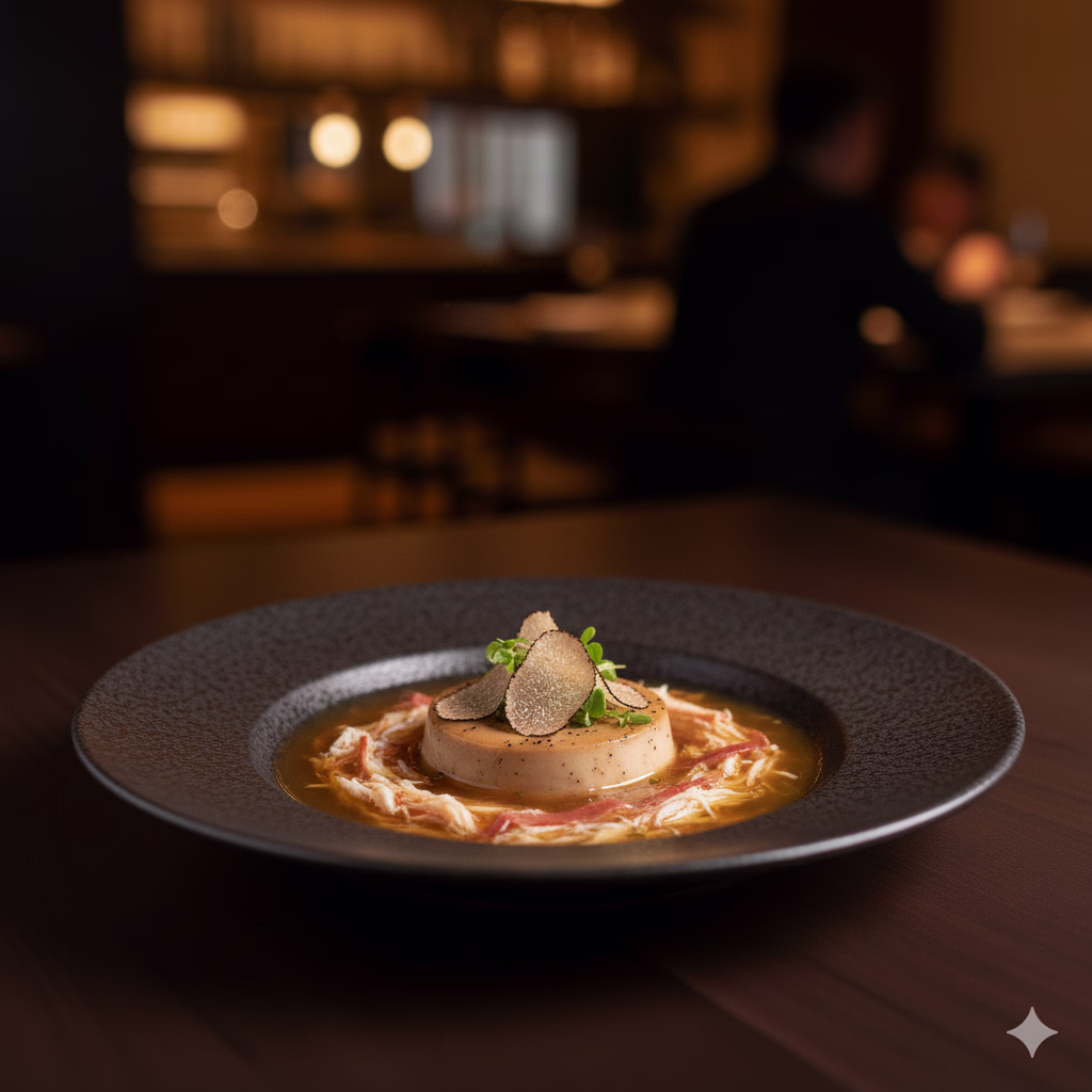 A faux-shark's fin soup made with Dungeness crab, Jinhua ham, and a black truffle steamed custard on the benu menu.