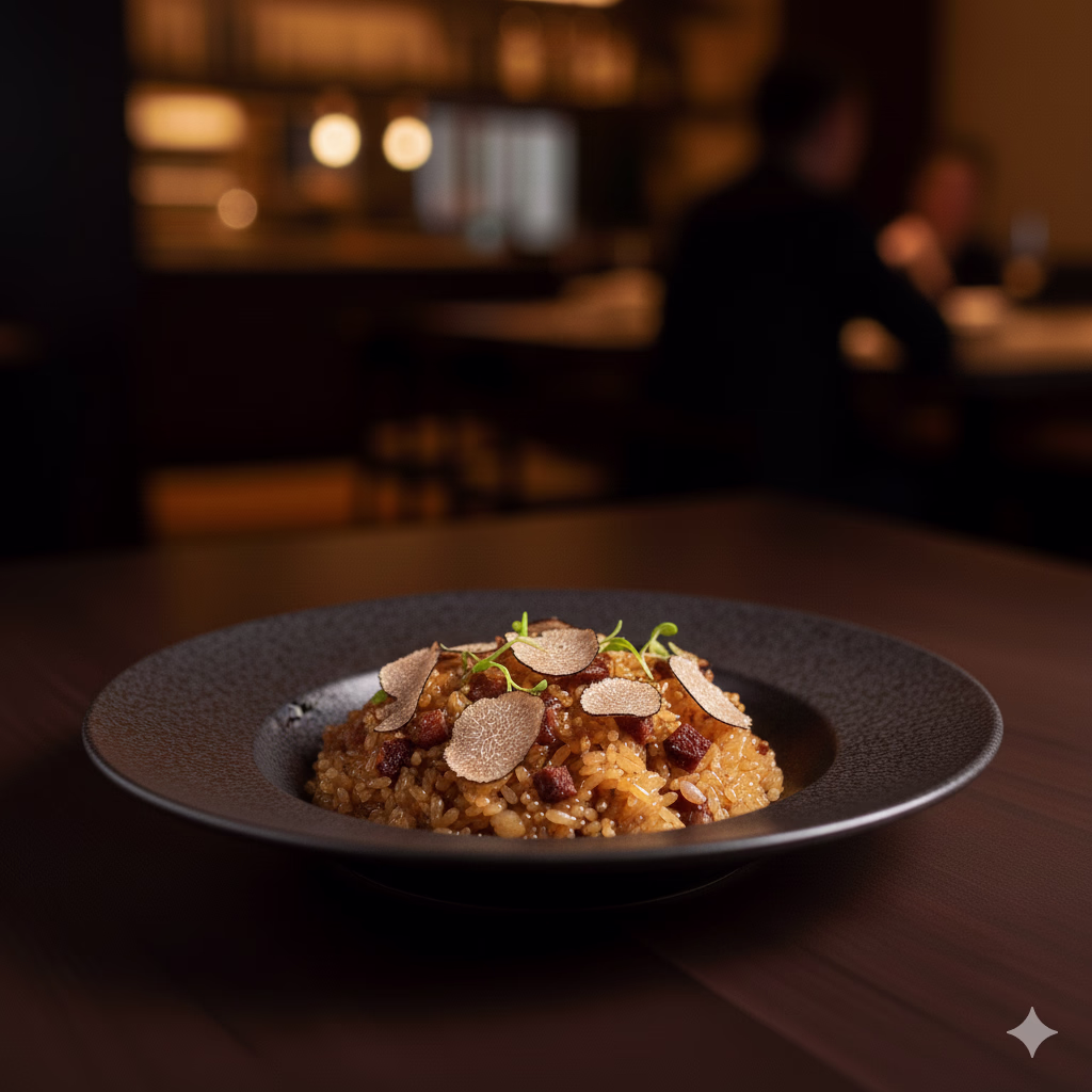 Hearty sticky rice mixed with smoked quail and black truffle, a savory and comforting course on the benu menu.