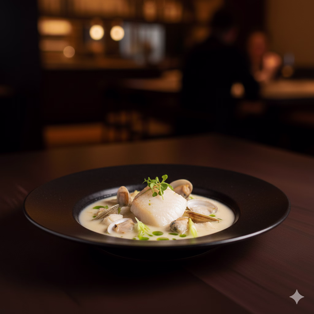 A white seafood stew featuring halibut fin and cockles in a rich, long-aged fermented bean paste from the benu menu.