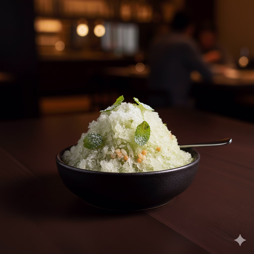 A refreshing palate cleanser on the benu menu made of malt and rice, served as a shaved frozen drink with toasted mint.