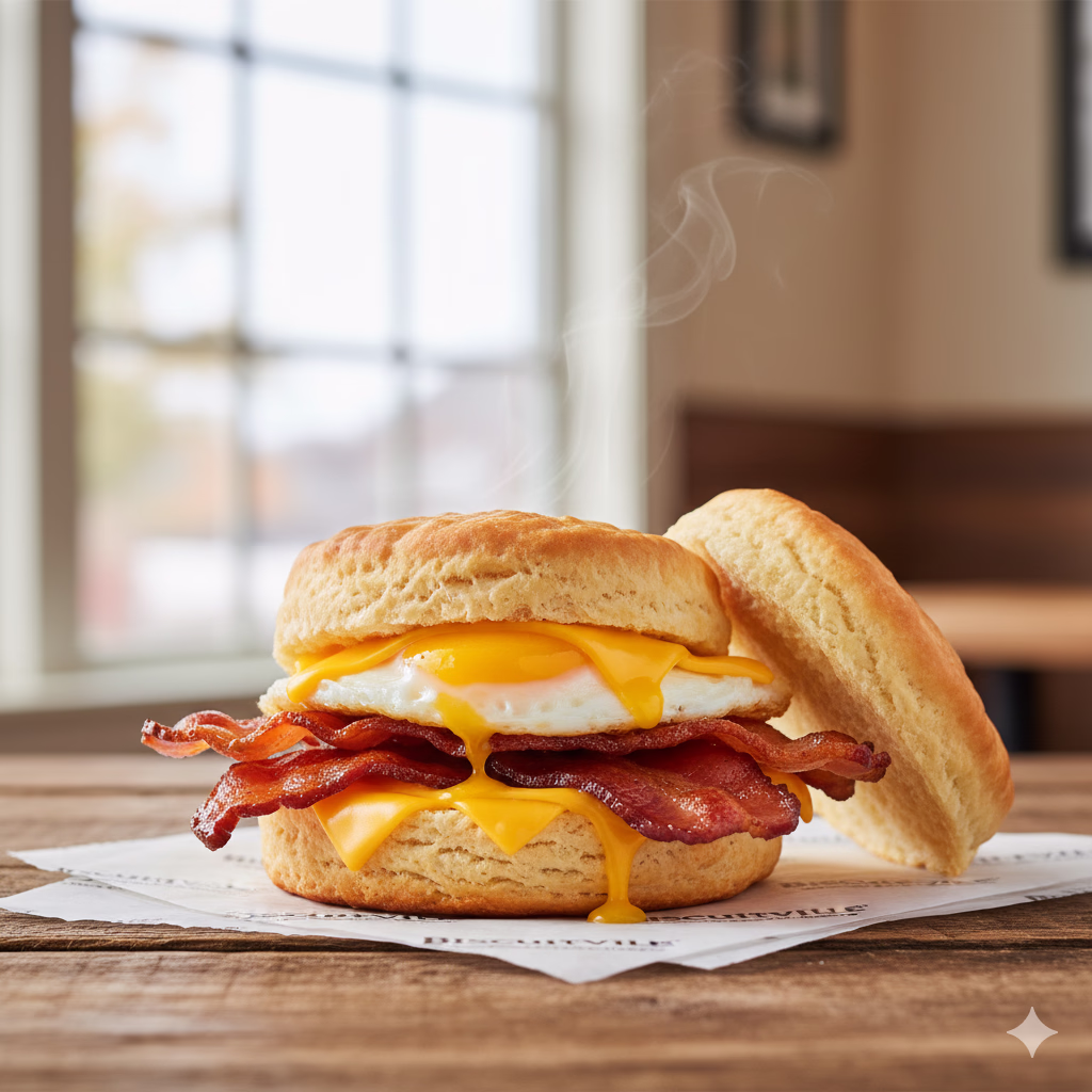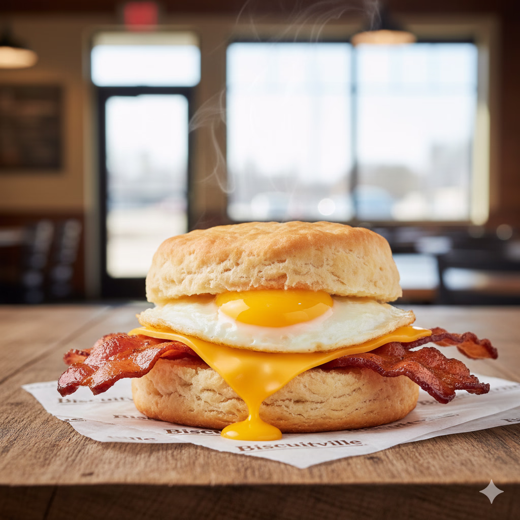 Two strips of bacon, a fresh egg, and American cheese on a signature biscuit. A popular combo from the biscuitville menu.