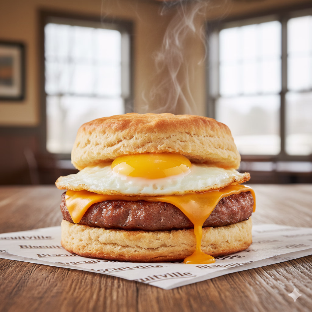 A savory sausage patty and egg served on a fresh-baked biscuit. A classic item on the biscuitville menu.