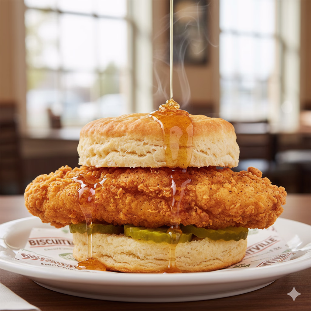 Spicy fried chicken breast topped with a drizzle of honey, offering a sweet and spicy kick on the biscuitville.