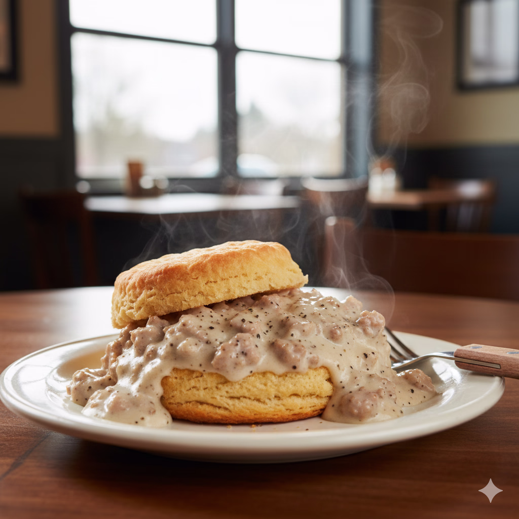 Hot, rich Sausage Gravy poured over a fresh, open-face biscuit. A traditional dish on the biscuitville menu.