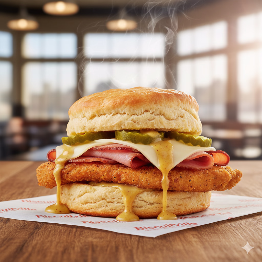 Fried Pork Chop, Country Ham, cheese, pickles, and honey mustard. A unique, flavorful twist on the biscuitville menu.