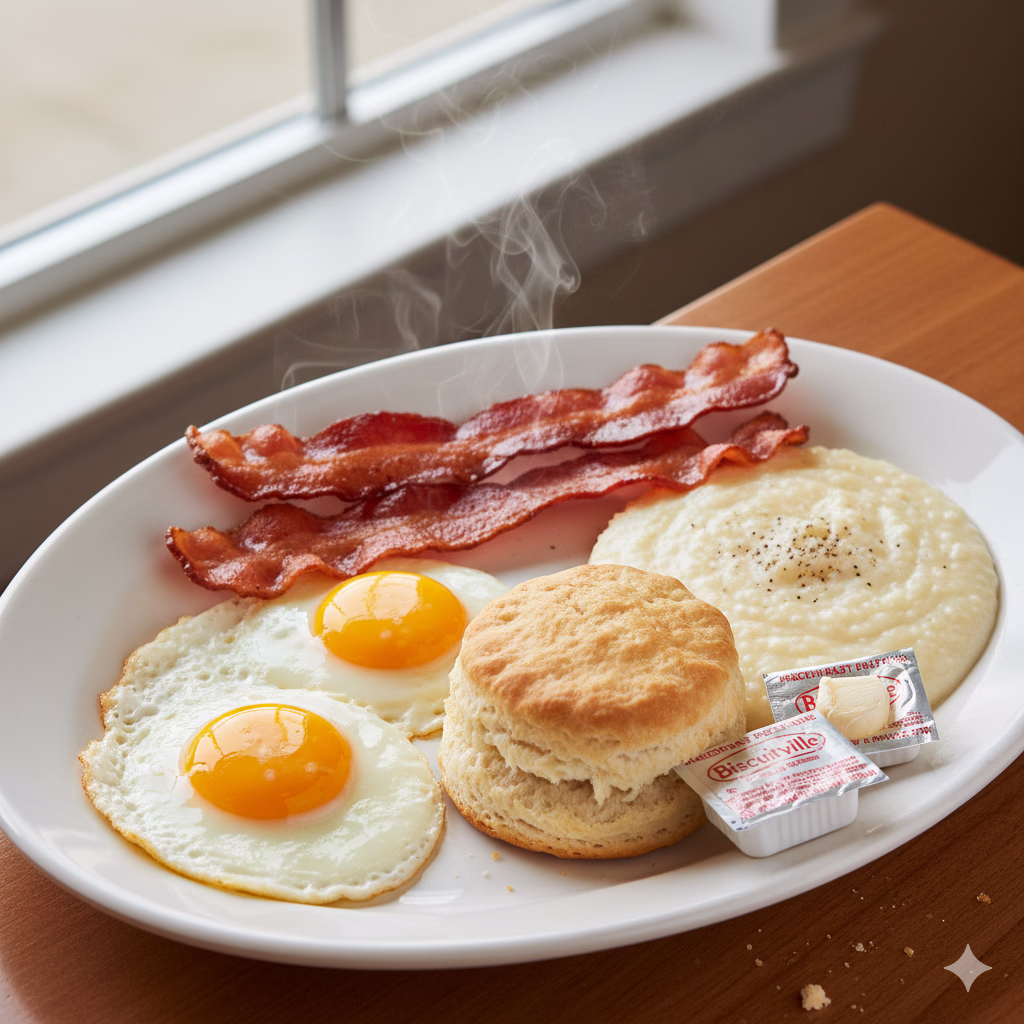 Two eggs cooked your way, choice of Meat (Bacon/Sausage/Ham), one Biscuit, and your choice of Grits or Hashbrown. A customizable meal on the biscuitville menu.