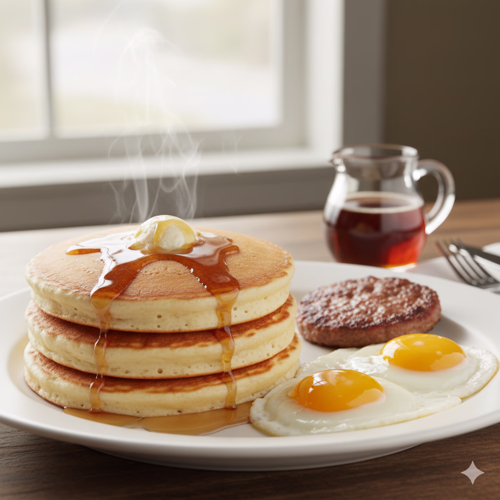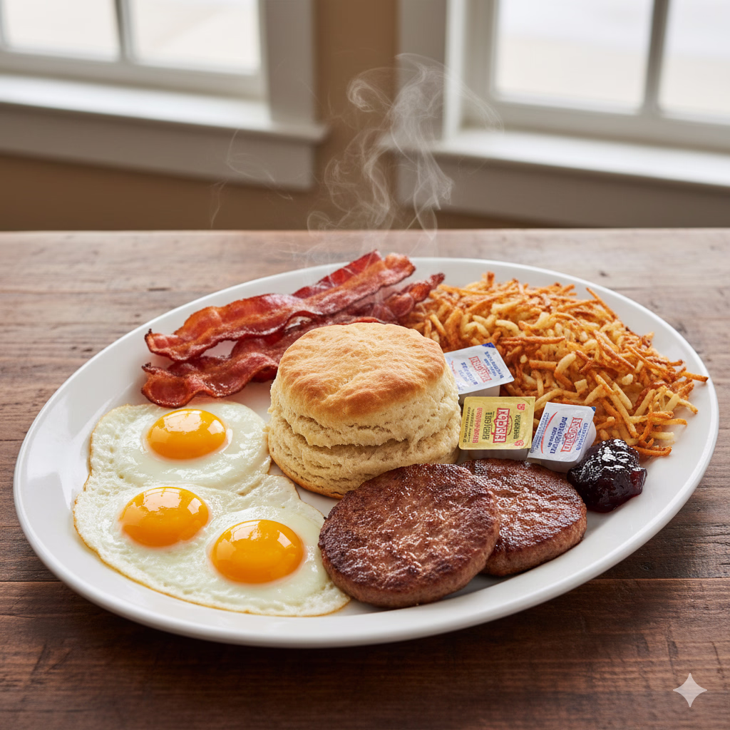 Three fluffy Pancakes, two eggs, and your choice of Meat (Bacon/Sausage/Ham). A classic sweet and savory combo on the biscuitville menu.