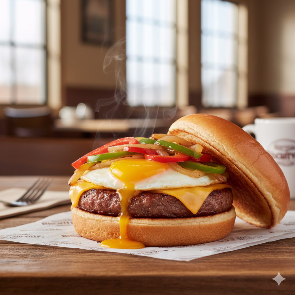 Smoked Sausage, Fried Egg, and Cheese with Peppers & Onions. A flavorful specialty sandwich on the biscuitville.