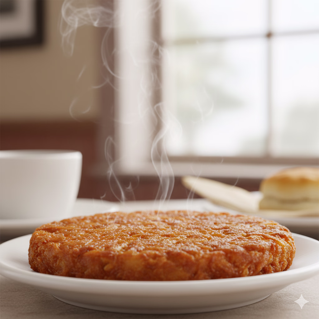 A crispy fried hashbrown patty. A classic breakfast side available on the biscuitville.