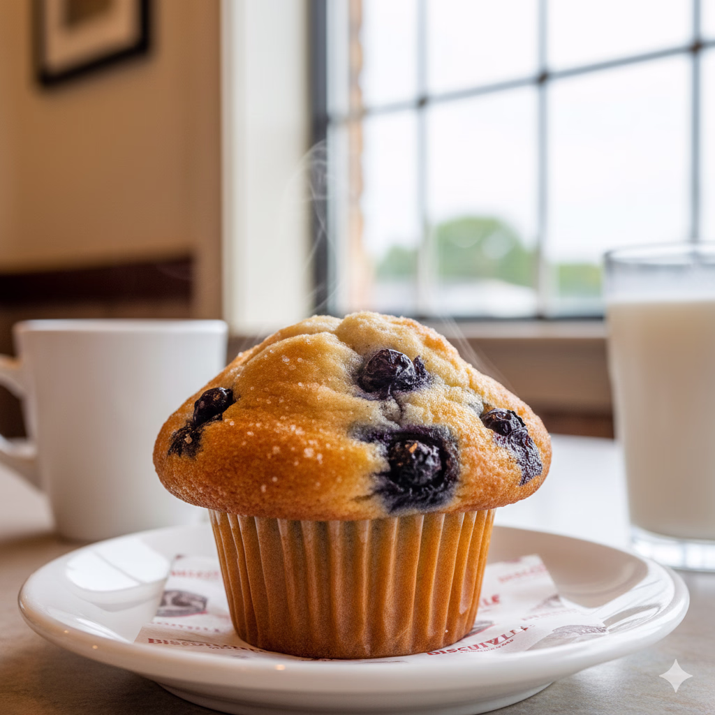 A freshly baked Blueberry Muffin. A simple, fruity baked good from the biscuitville.