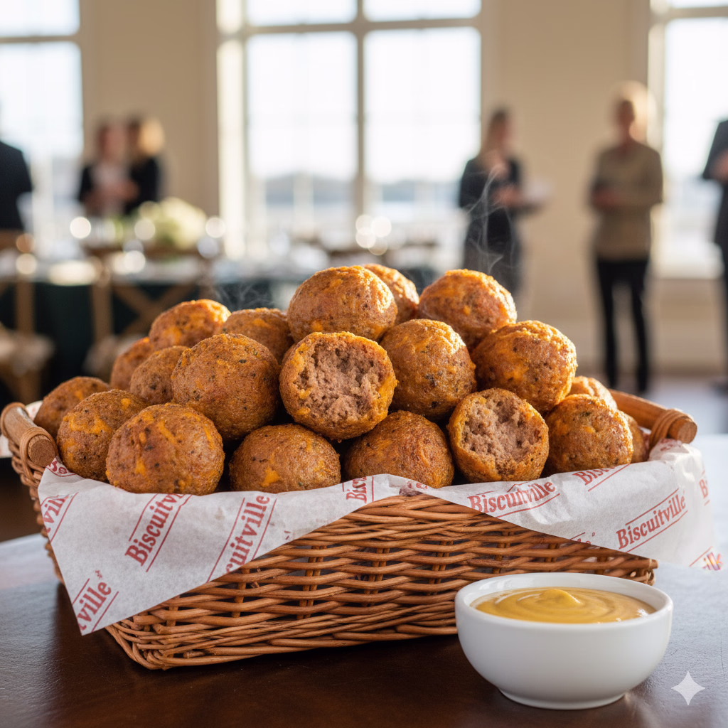 Small balls made of sausage, cheddar cheese, and biscuit mix. A perfect bite-sized catering appetizer from the biscuitville.