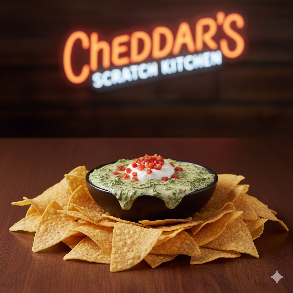 A creamy blend of spinach and cheeses topped with sour cream and served with tortilla chips, found on the cheddars.