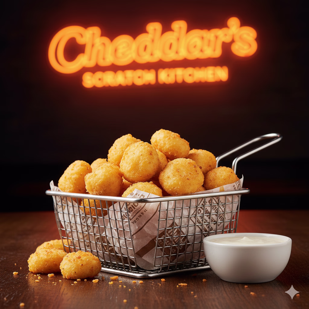 Lightly battered and fried white cheddar cheese curds served with a side of ranch on the cheddars menu.