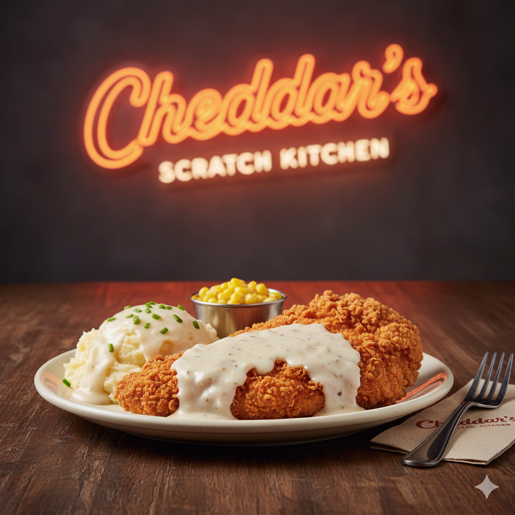 Hand-breaded chicken breast topped with savory cream gravy, served with two sides from the cheddars.