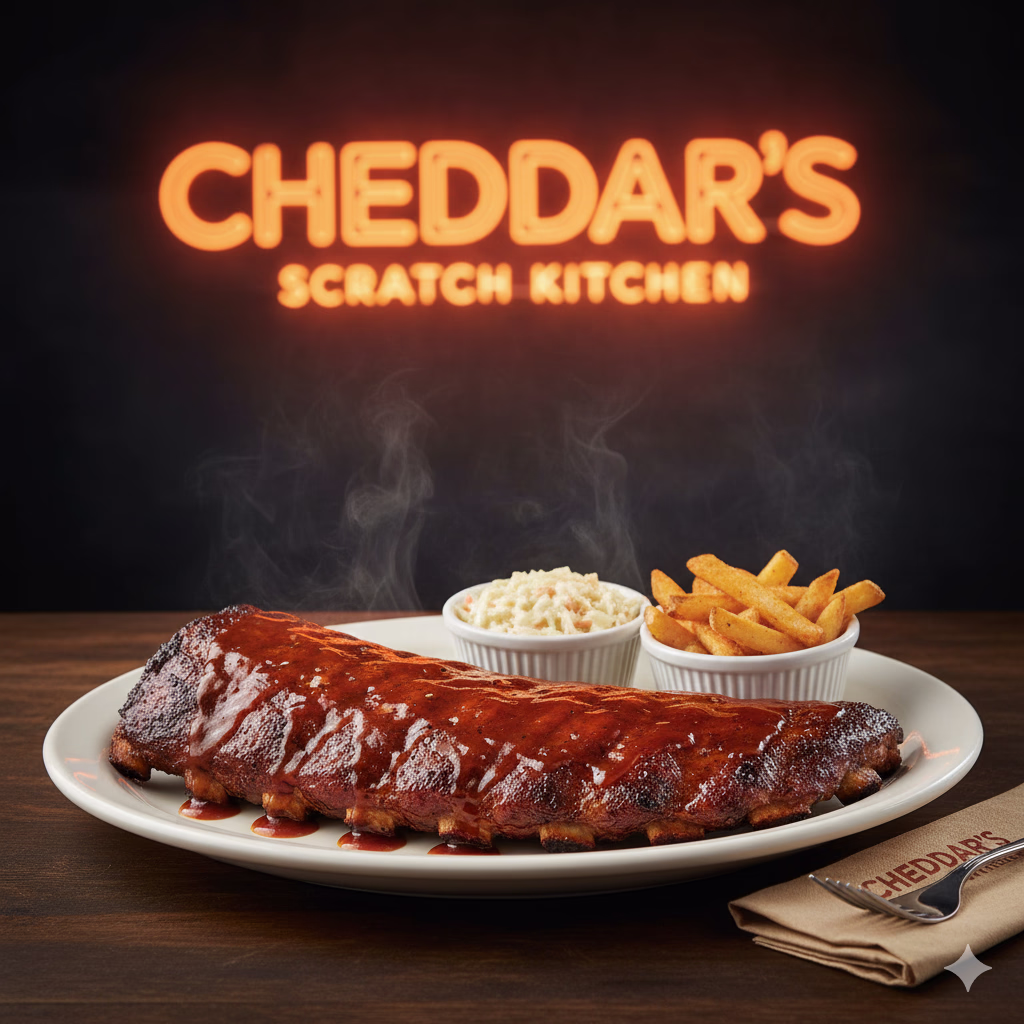 Slow-smoked in-house and basted with honey BBQ sauce, available as a full or half rack on the cheddars.