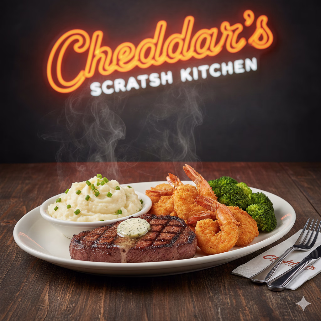 A center-cut top sirloin paired with grilled or fried shrimp, featured prominently on the cheddars menu.