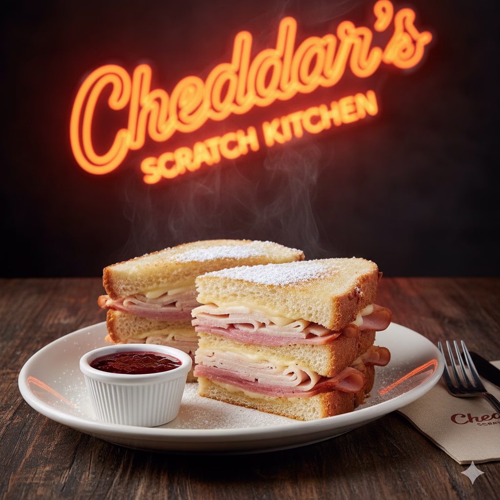 Smoked ham, turkey, and cheese battered and fried, served with raspberry preserves—a unique find on the cheddars menu.