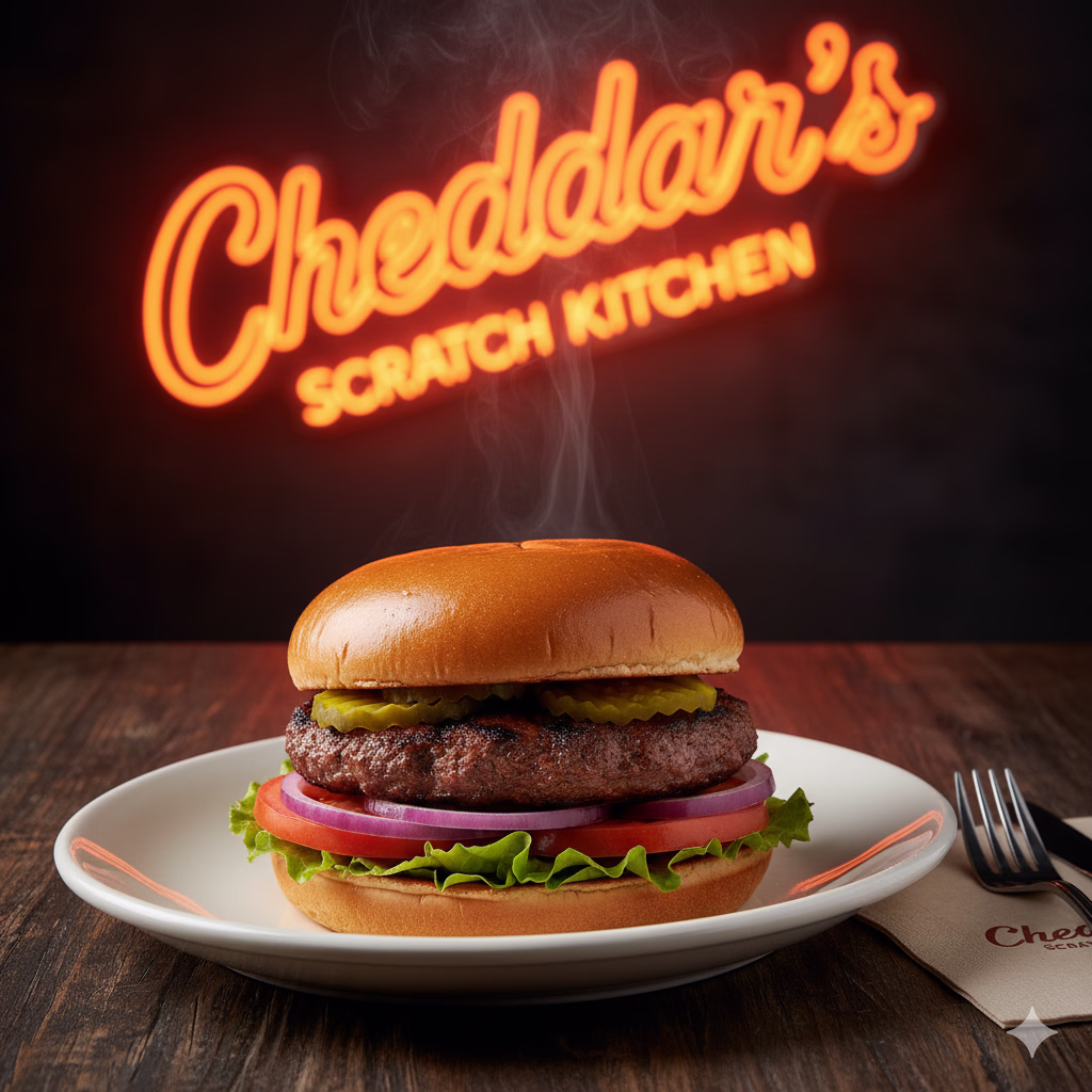 A half-pound burger with lettuce, tomato, pickles, and onions on a toasted bun from the cheddars menu.