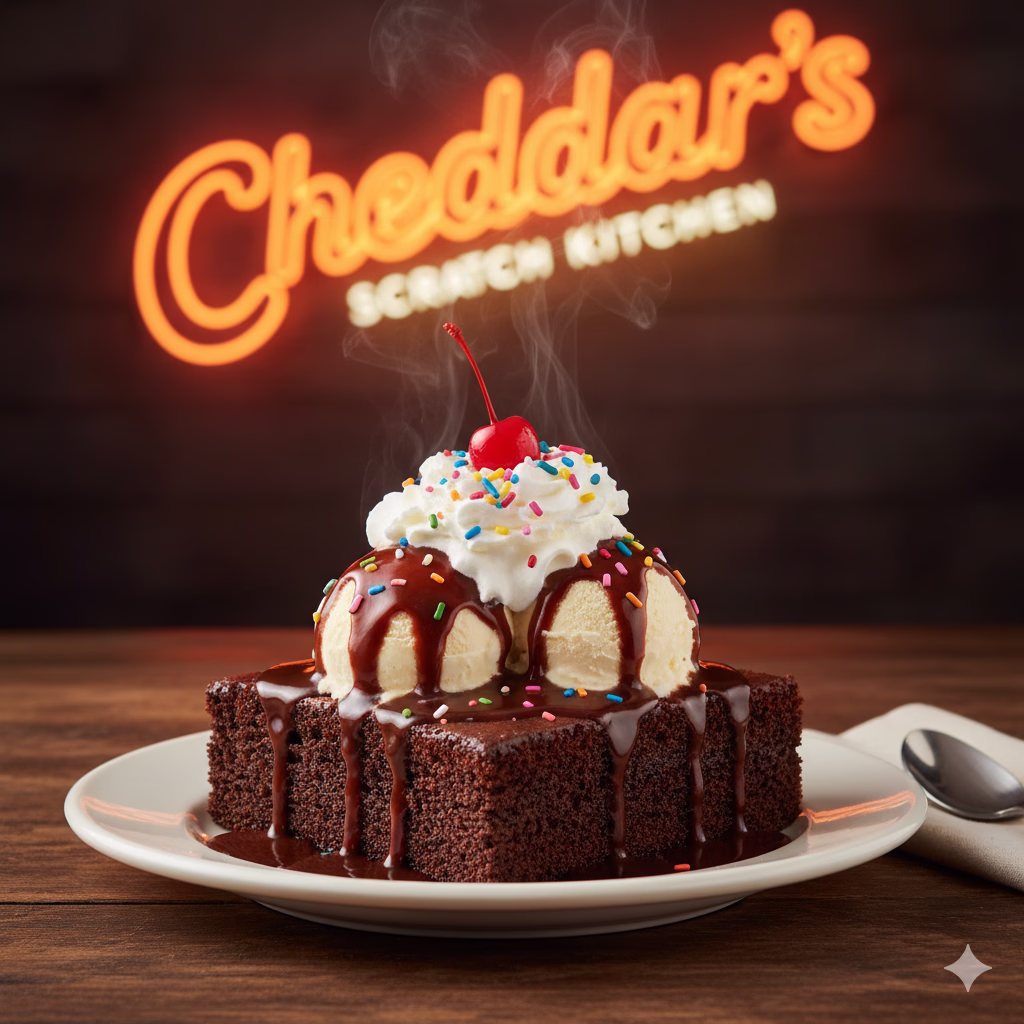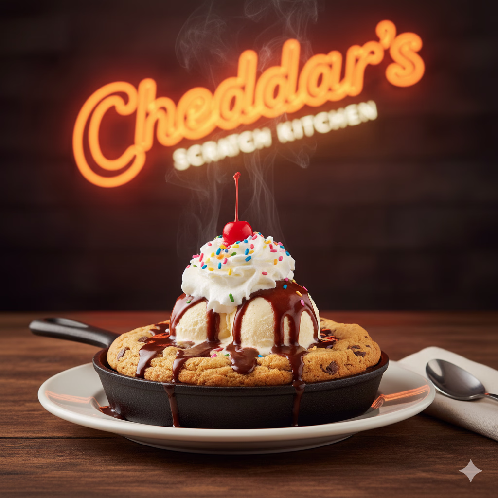 A warm chocolate chip cookie topped with vanilla ice cream, hot fudge, and whipped cream on the cheddars menu.