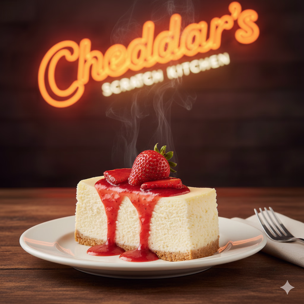 A rich, creamy New York-style cheesecake served with a strawberry purée on the cheddars menu.