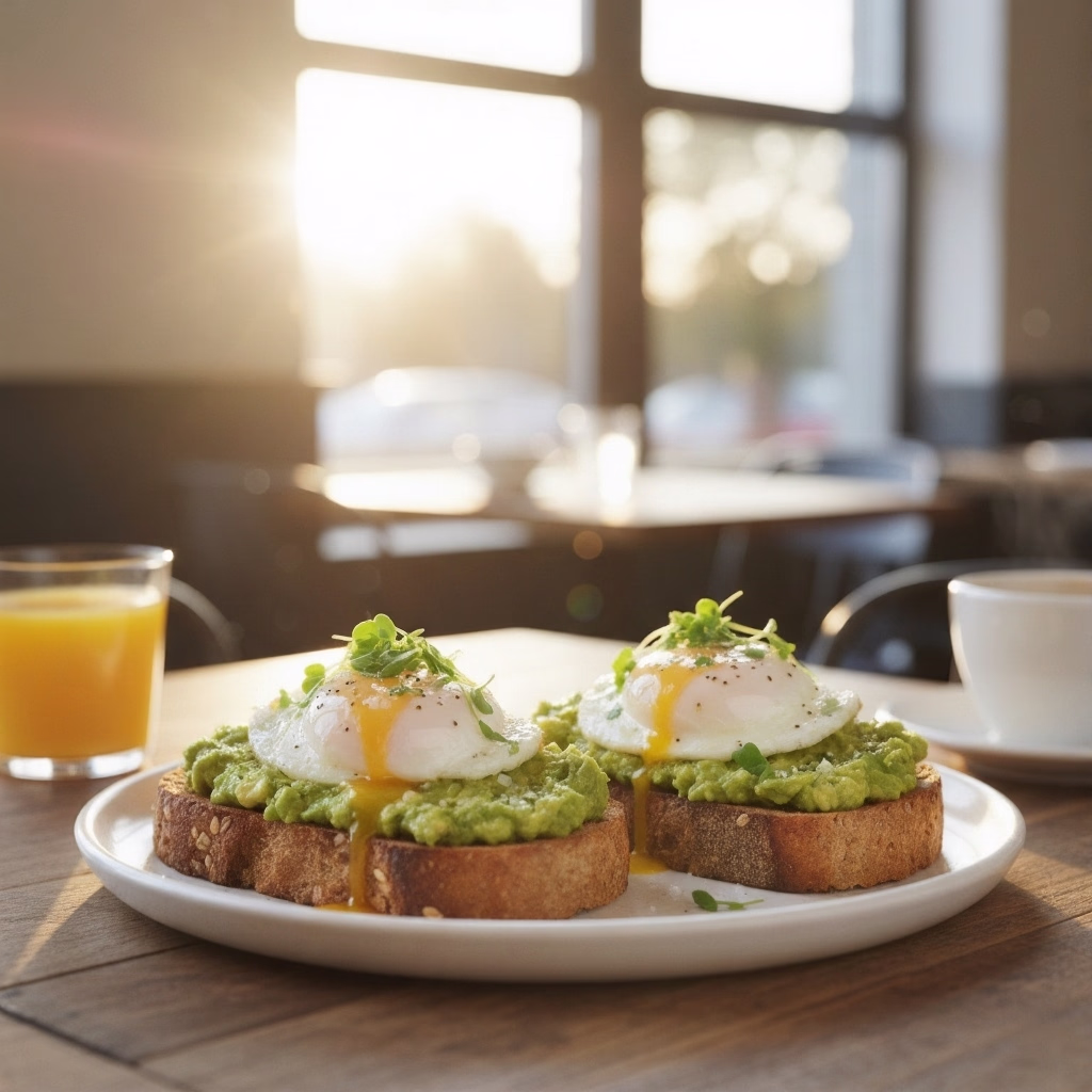 Thick-cut whole grain toast, topped with fresh avocado, EVOO, Lemon, Sea Salt, and Two Basted Eggs. A fresh, trendy favorite on the first watch.