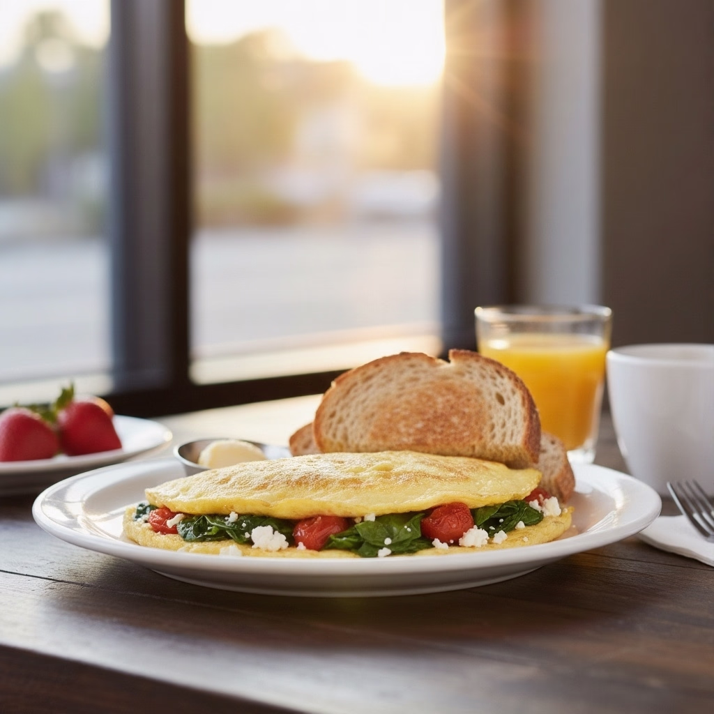 Egg White Omelet with house-roasted Crimini Mushrooms, Spinach, Onion, and Tomato, served with a Side of Chicken Sausage. A low-fat, savory choice on the first watch.