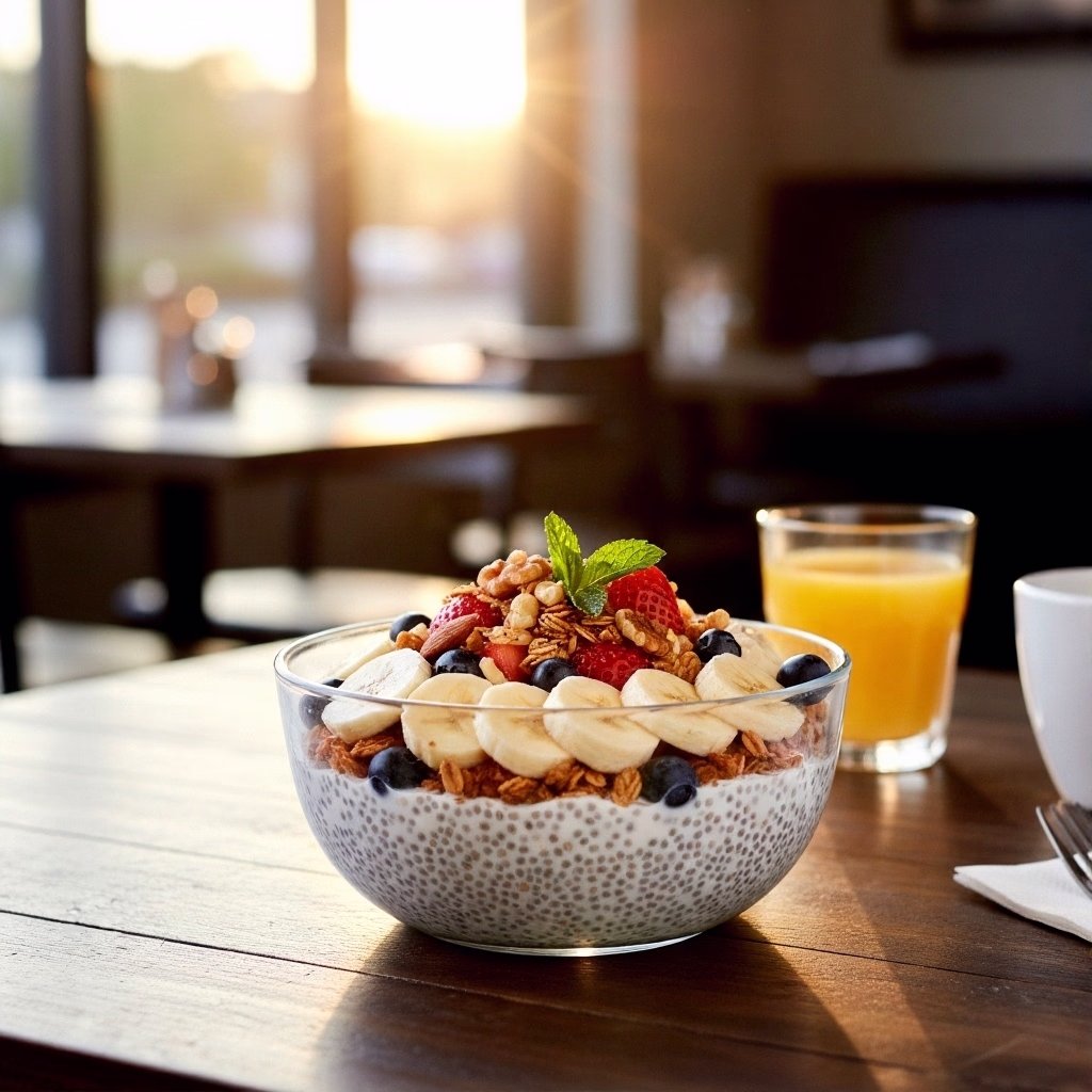 Coconut Milk chia seed pudding, fresh fruits (Banana, Berries), Granola, and nuts. A chilled, plant-based power bowl on the first watch.