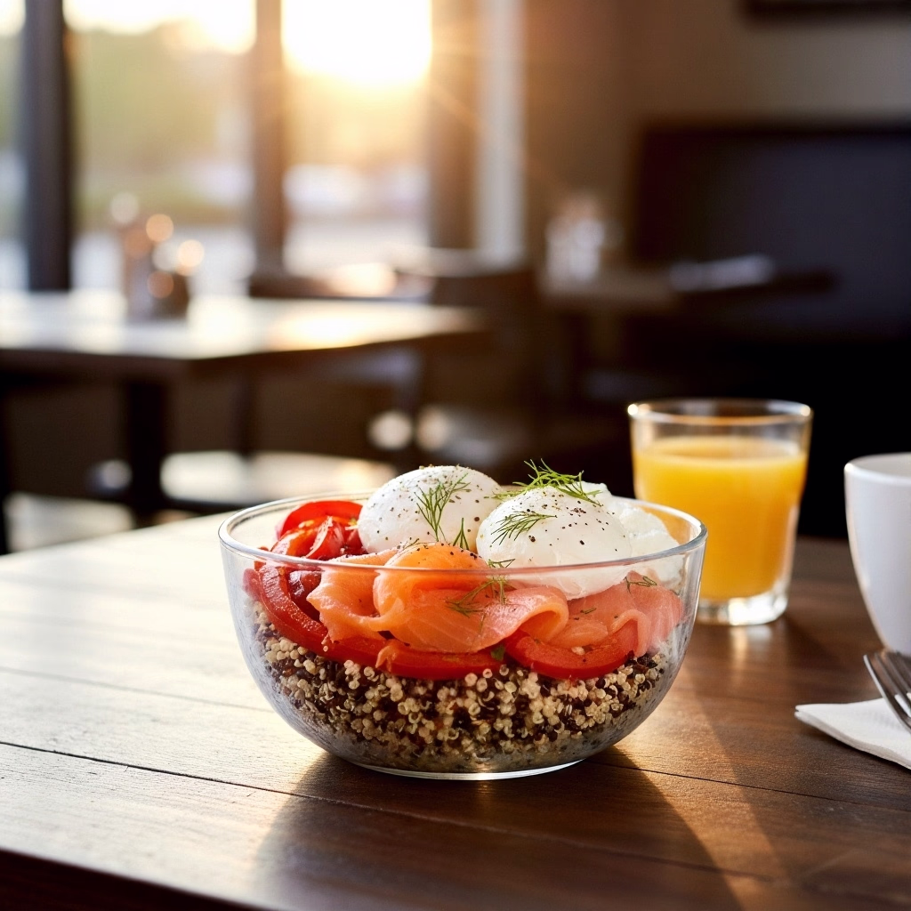 Quinoa, Smoked Salmon, Black Rice, House-Roasted Red Peppers, Eggs, and Cream Cheese. A gourmet, savory grain bowl from the first watch.
