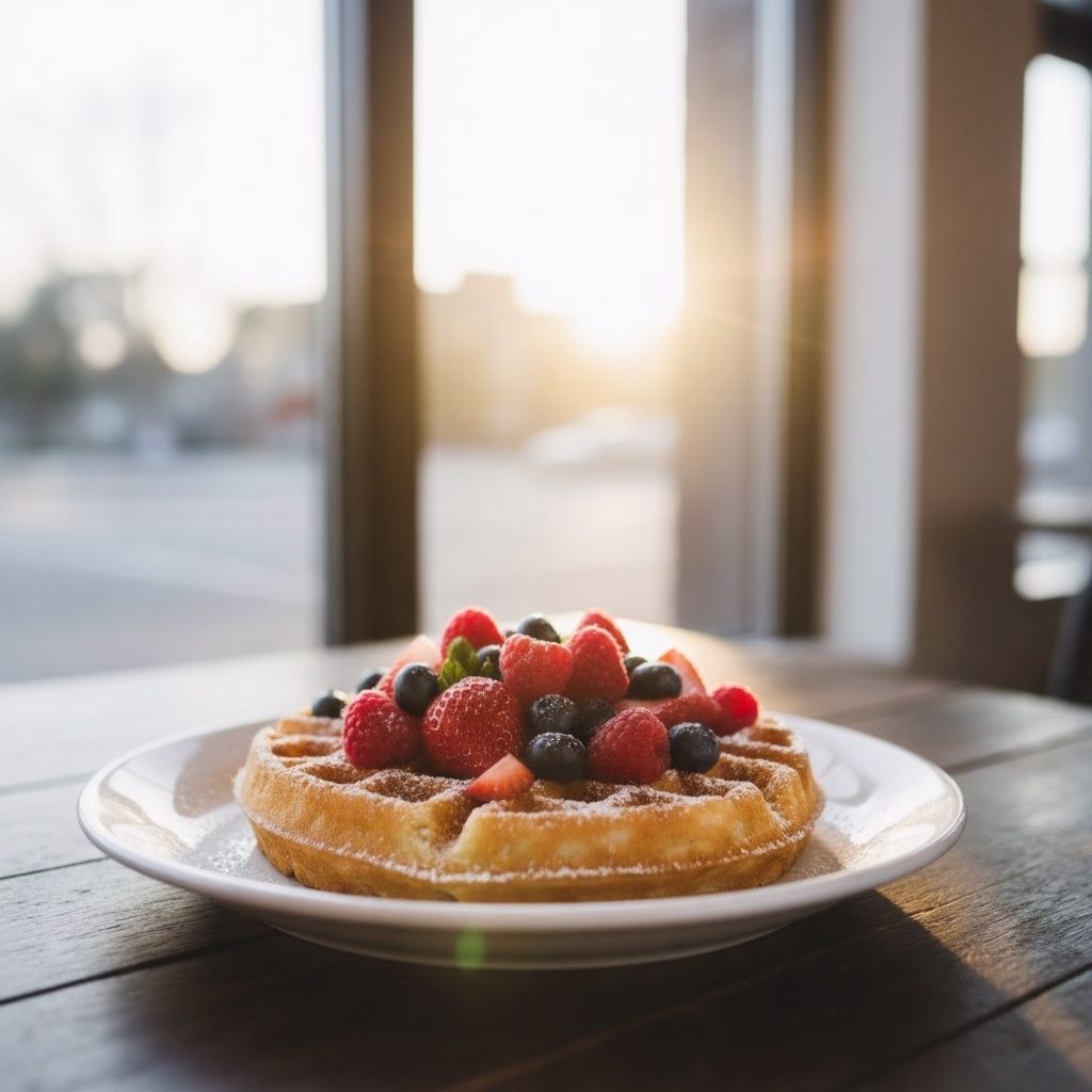 A thick, crispy Belgian Waffle, dusted with powdered sugar and topped with fresh berries. A classic breakfast treat from the first watch.