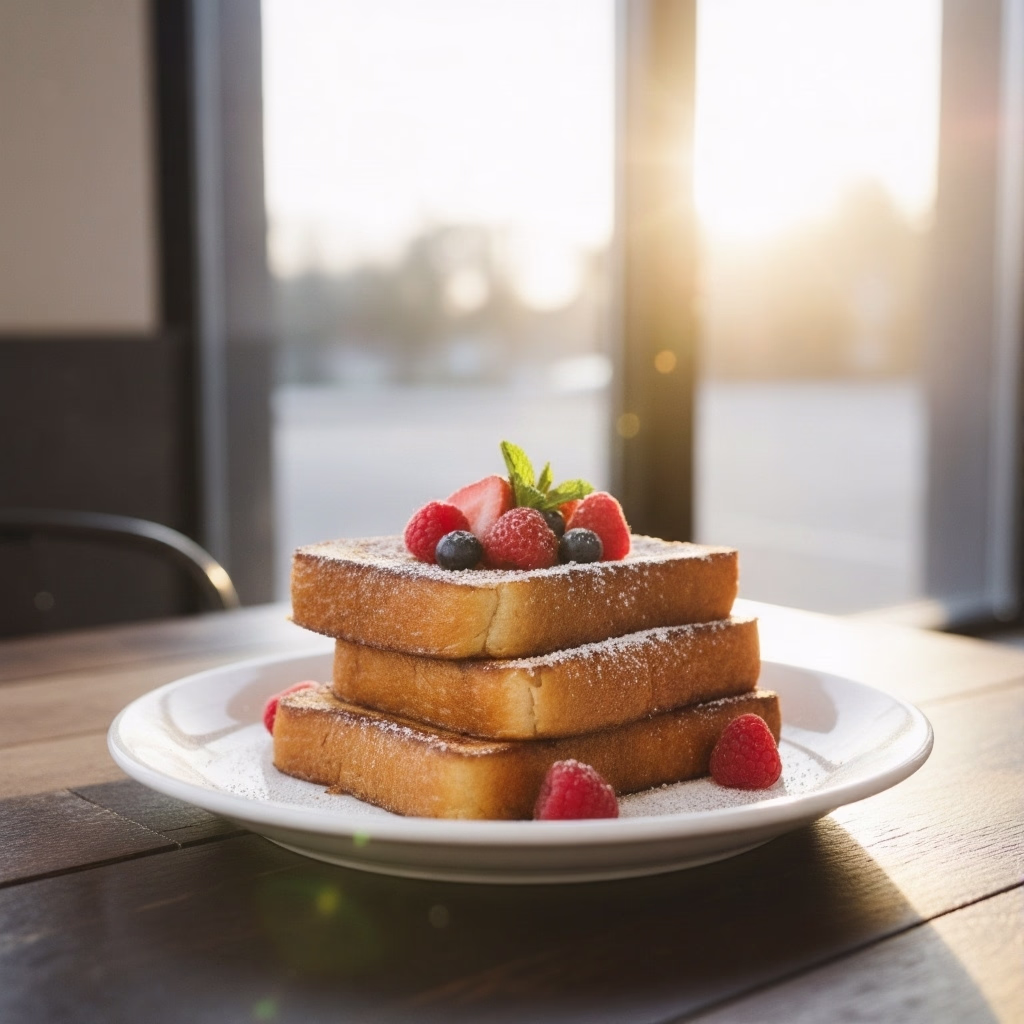 Thick-cut Brioche bread, soaked in egg batter and grilled, finished with cinnamon and powdered sugar. A rich, comforting option on the first watch.