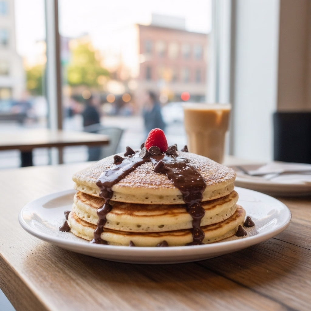 Buttermilk pancake loaded with chocolate chips. A simple, sweet favorite on the first watch menu.