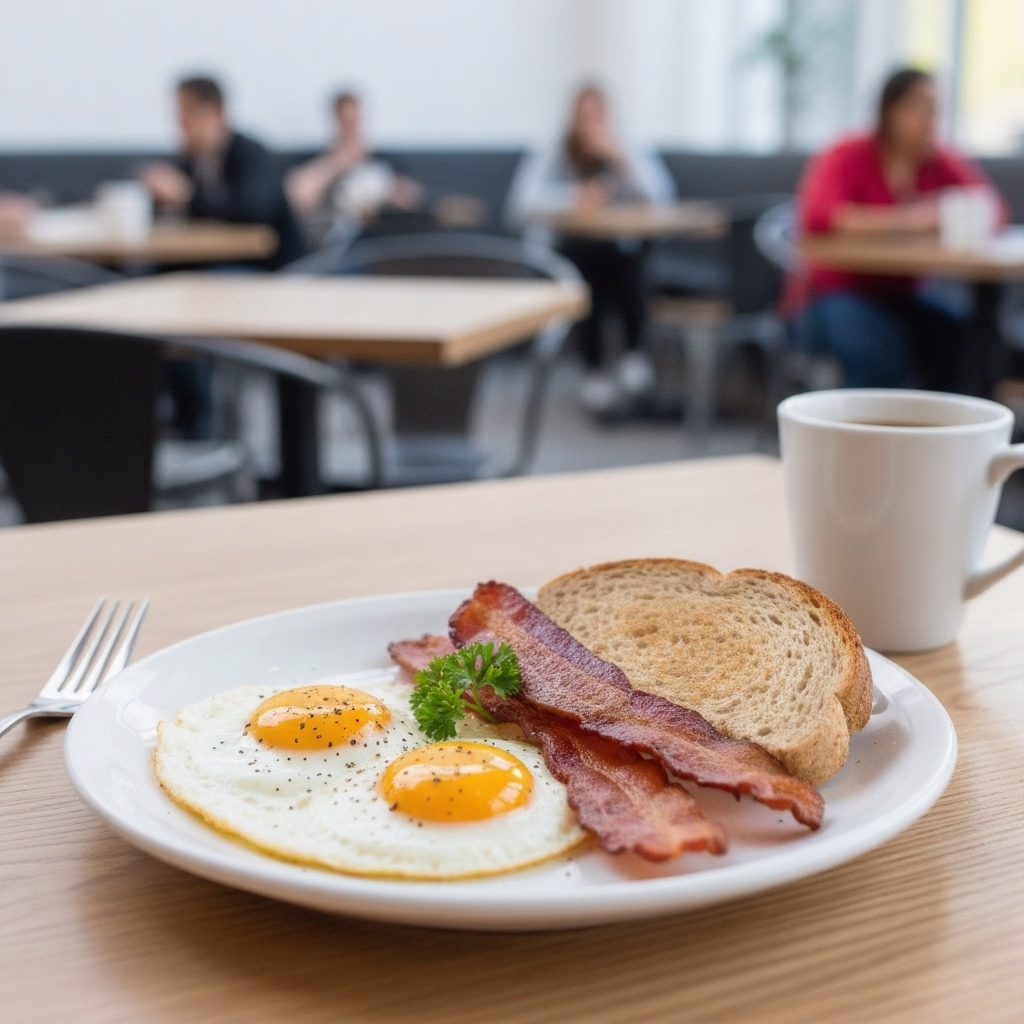 Two Eggs (cooked to order), choice of Bacon, Pork Sausage, or Turkey Sausage, and served with Toast. The classic breakfast staple on the first watch.