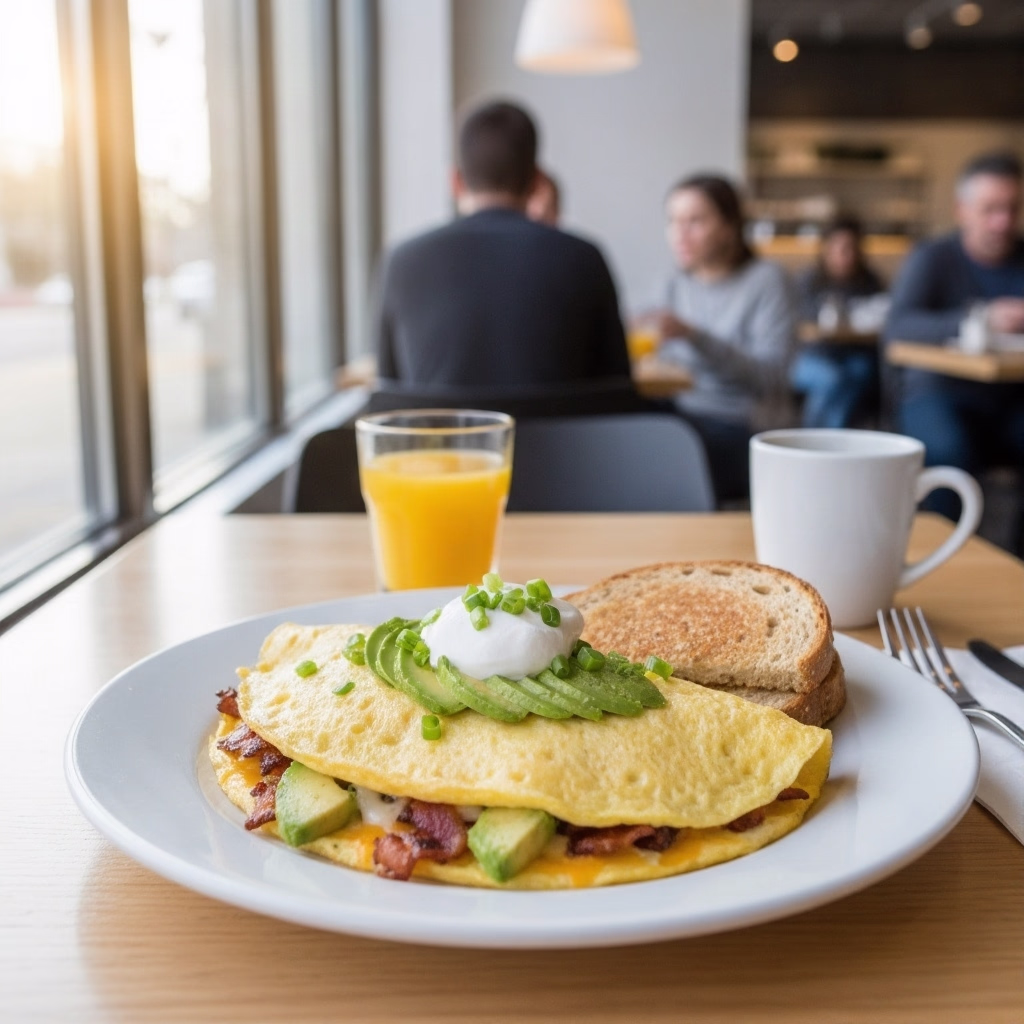 Omelet with Bacon, Avocado, Monterey Jack cheese, and sour cream. A creamy, popular omelet from the first watch menu.