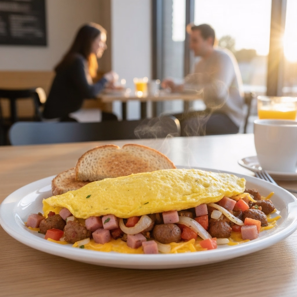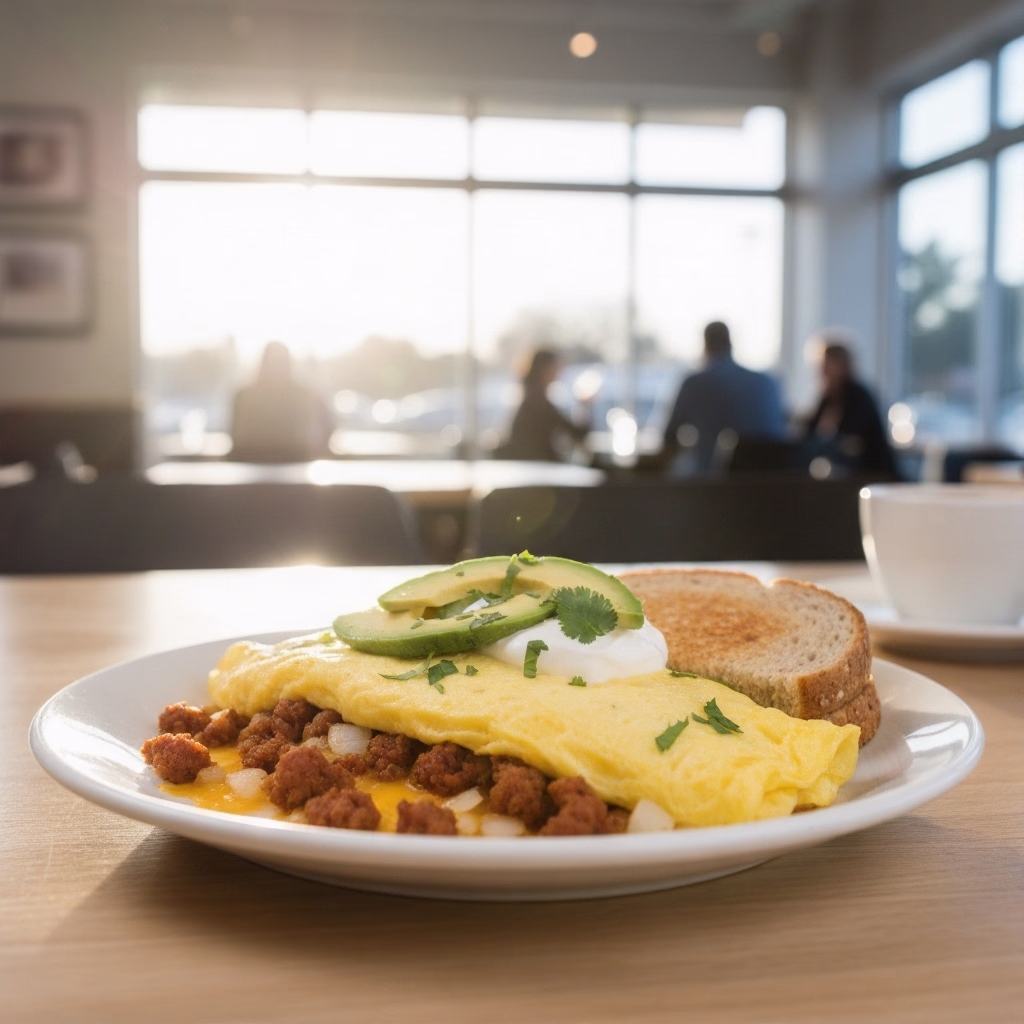 Omelet featuring Chorizo sausage, Avocado, Monterey Jack cheese, Onion, Cilantro, and Sour Cream. A savory, spicy option on the first watch.