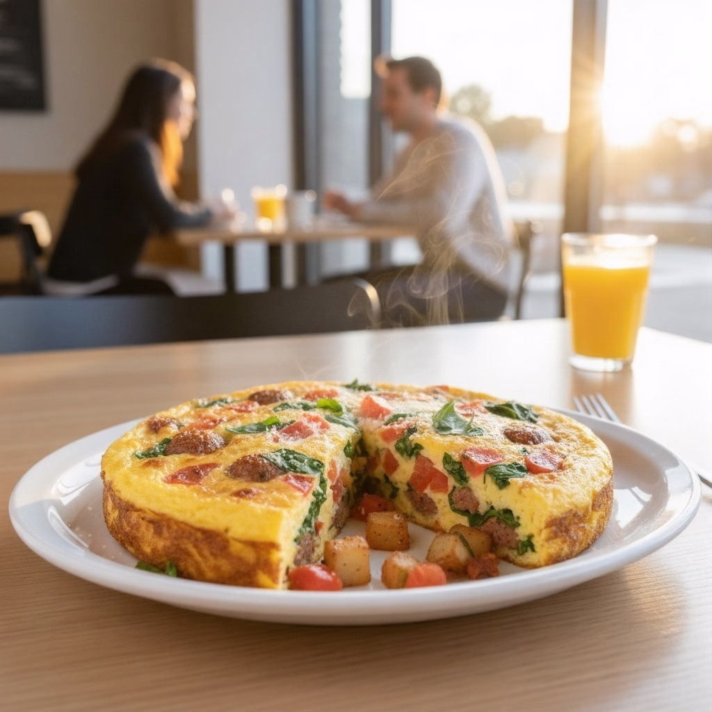 Italian sausage, Roasted Potatoes, Tomato, Spinach, Mozzarella, and Parmesan Cheese. A baked, hearty Italian-style egg dish from the first watch menu.