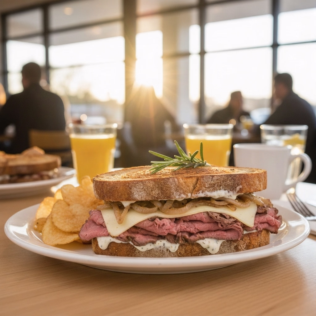 Roast Beef, Havarti cheese, Roasted Onions, and Horseradish Cream on Grilled Sourdough. A robust, premium deli option on the first watch menu.
