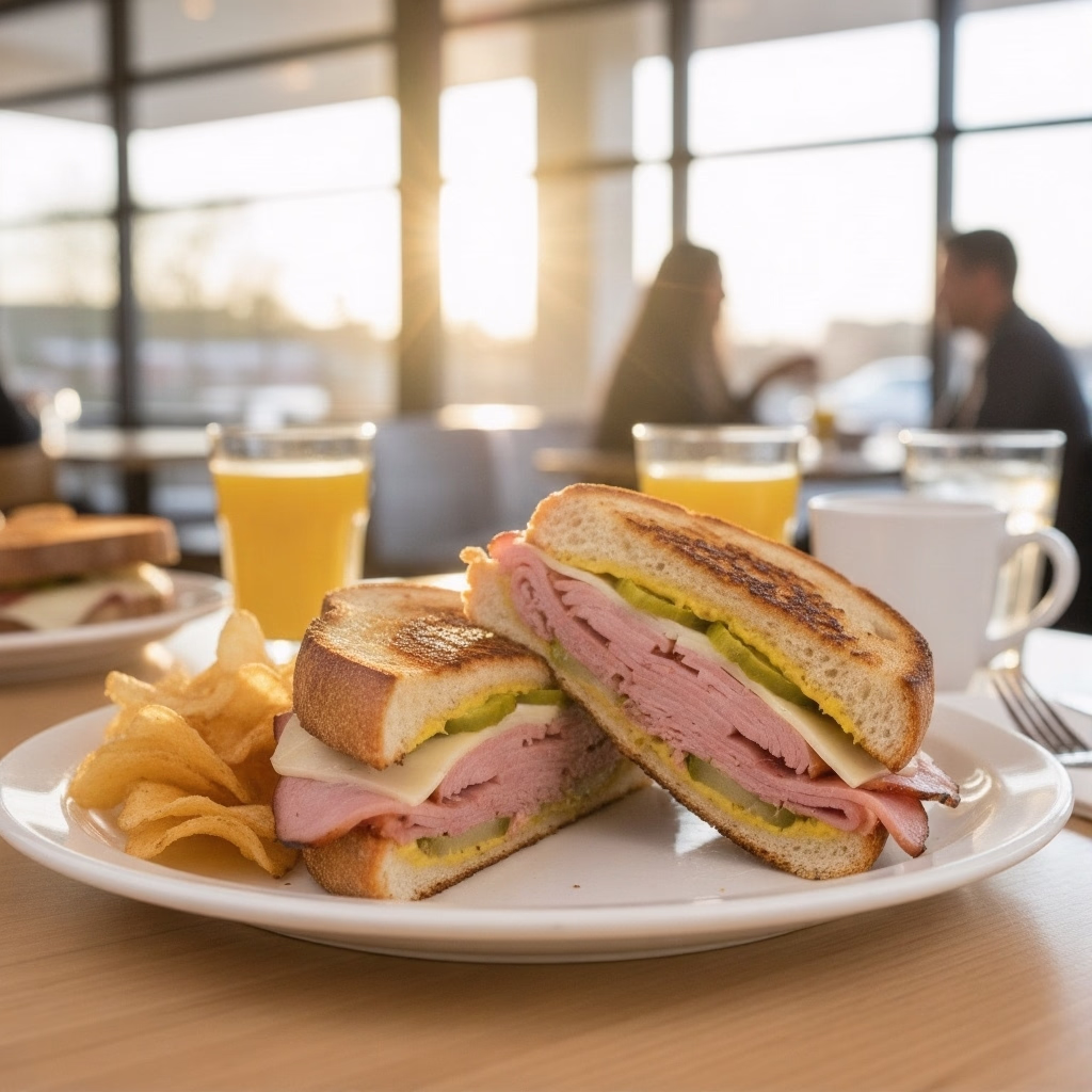 Ham, Pulled Pork, Swiss cheese, Pickles, and Mustard on a Grilled Hoagie Roll. A pressed, tangy specialty sandwich from the first watch menu.