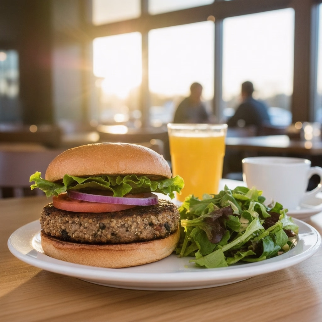 Quinoa, Crimini Mushroom, and Black Bean patty, served with a side of Greens or Fruit. A flavorful vegetarian burger option on the first watch menu.