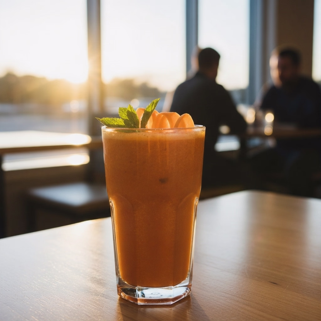 Fresh juice blend of Carrot, Ginger, Apple, and Orange. A vibrant and spicy fresh juice from the first watch menu.