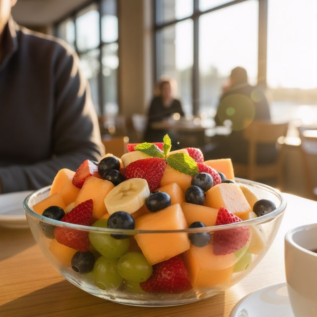 Freshly cut seasonal fruit bowl. A light, healthy side option from the first watch menu.