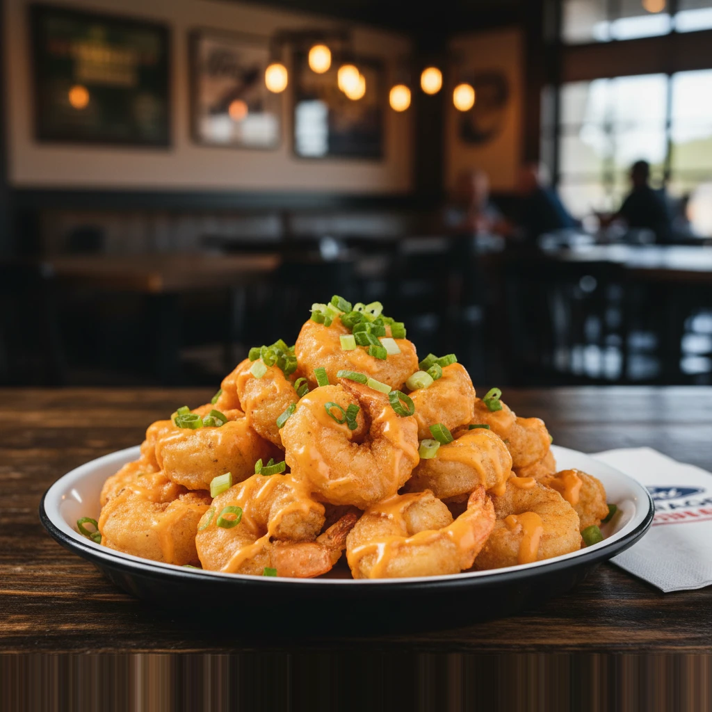 Lightly battered crispy shrimp tossed in spicy “Boom Boom” sauce and topped with green onions on the fords garage.
