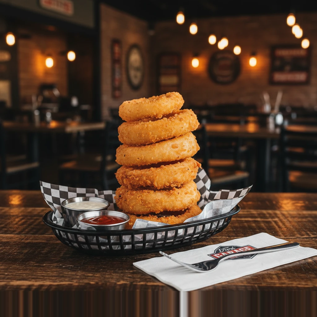 A massive tower of golden-brown onion rings served with house-made chipotle ketchup and ranch from the fords garage.