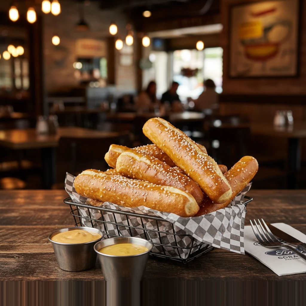 Soft, salted pretzels served with Ford's Beer Cheese and honey mustard dipping sauces on the fords garage.