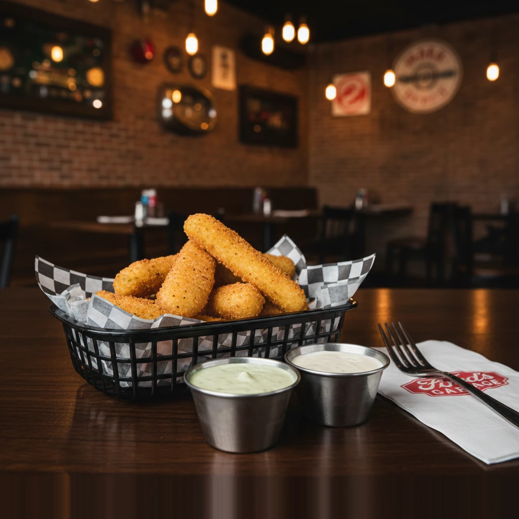 Hand-breaded pickle spears in a panko crust served with cucumber wasabi dipping sauce, a unique pick on the fords garage.